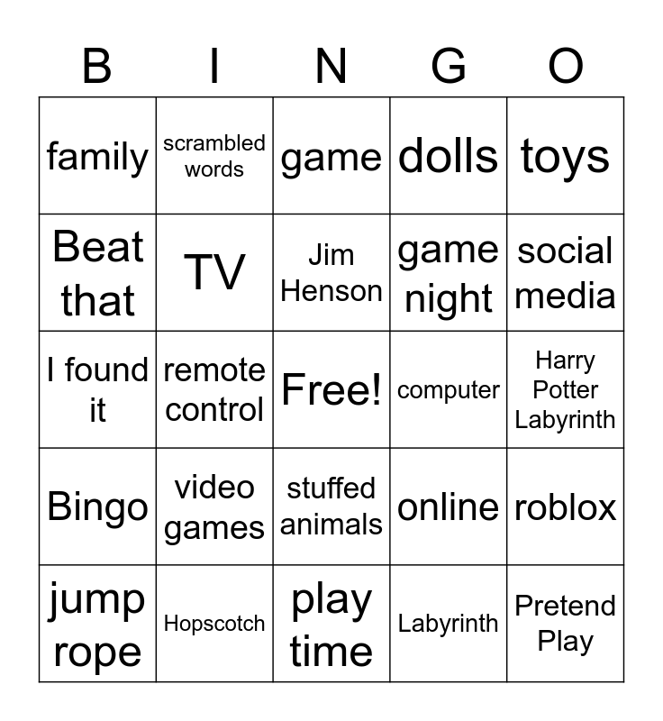 This bingo card has a free space and 24 words: video games, Hopscotch, Jim Henson, jump rope, toys, family, Beat that, scrambled words, computer, stuffed animals, game night, I found it, online, roblox, TV, Labyrinth, Harry Potter Labyrinth, game, social media, remote control, Pretend Play, Bingo, dolls and play time.