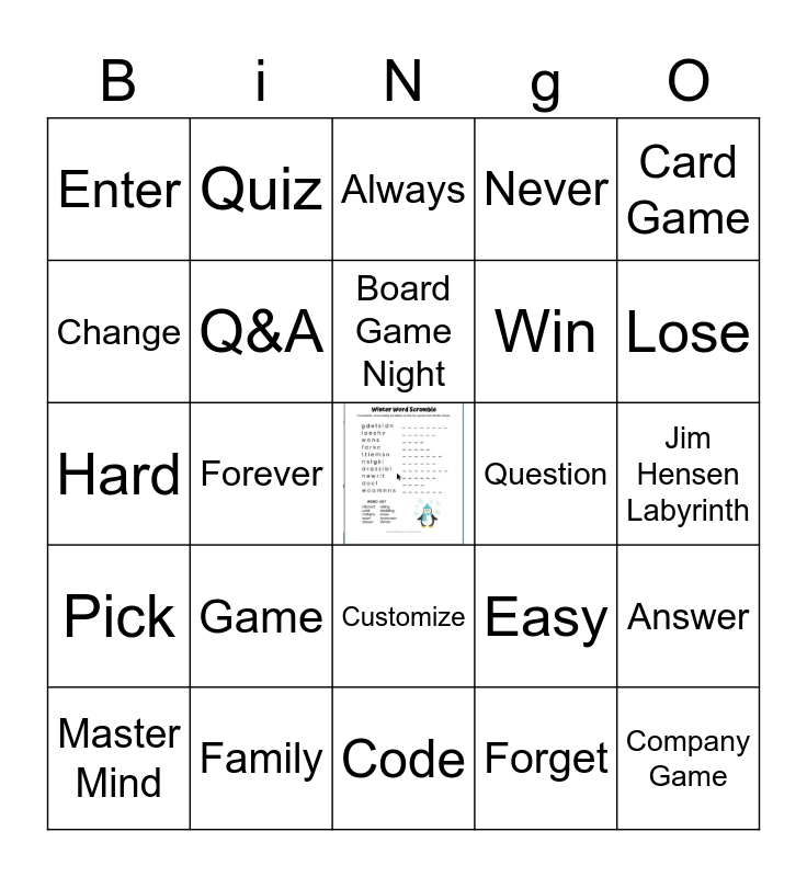 This bingo card has a free space and 24 words: Game, Family, Board Game Night, Master Mind, Card Game, Enter, Change, Quiz, Question, Customize, Win, Hard, Easy, Answer, Q&A, Forget, Jim Hensen Labyrinth, Always, Lose, Forever, Company Game, Pick, Never and Code.