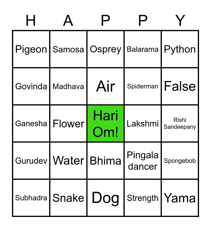This bingo card has a free space and 50 words: Earth, Yama, Bakasura, Dog, Water, Yashoda, Samosa, Fire, Govinda, Keshava, Madhava, Balarama, Spongebob, Pingala dancer, Vasudeva& Devaki, Sun, Air, Lakshmi, Flute, Python, Flower, Strength, Pigeon, Spiderman, Parijatha, Child, False, Balavihar, Osprey, Bhima, Seetha Aunty, Tree, Larva, True, Snake, Sudama, Arrow maker, Kamsa, Poothana, Rishi Sandeepany, Spider, Chandana Aunty, Aghasura, Lord Vishnu, Subhadra, Ganesha, Santa Claus, McDonalds, Gurudev and Madhurashtakam.