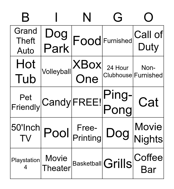 This bingo card has a free space and 24 words: Pool, Movie Theater, XBox One, Playstation 4, Call of Duty, Grand Theft Auto, Hot Tub, Dog Park, Ping-Pong, Free-Printing, 24 Hour Clubhouse, Pet Friendly, Dog, Movie Nights, Volleyball, Grills, Cat, Food, Non-Furnished, Candy, Coffee Bar, 50'Inch TV, Furnished and Basketball.