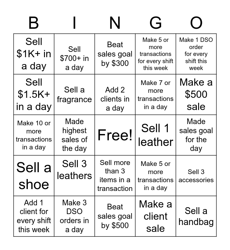 This bingo card has a free space and 24 words: Sell 3 leathers, Make 3 DSO orders in a day, Add 2 clients in a day, Add 1 client for every shift this week, Make 1 DSO order for every shift this week, Sell $1K+ in a day, Sell $1.5K+ in a day, Sell $700+ in a day, Sell 1 leather, Sell more than 3 items in a transaction, Make 7 or more transactions in a day, Make 10 or more transactions in a day, Make 5 or more transactions in a day, Sell 3 accessories, Sell a fragrance, Make a client sale, Made sales goal for the day, Beat sales goal by $300, Make a $500 sale, Made highest sales of the day, Sell a handbag, Sell a shoe, Make 5 or more transactions for every shift this week and Beat sales goal by $500.