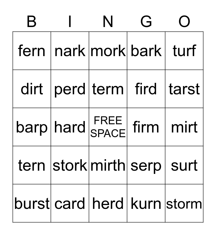 This bingo card has a free space and 24 words: stork, card, term, burst, turf, fern, dirt, nark, firm, mirth, fird, barp, serp, surt, perd, kurn, mirt, mork, tarst, hard, storm, tern, bark and herd.