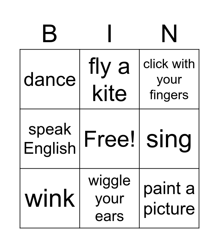 This bingo card has a free space and 14 words: cross your fingers, do splits, sing, dance, click with your fingers, speak English, do a headstand, juggle, cross your eyes, fly a kite, paint a picture, wink, wiggle your ears and drive a car.