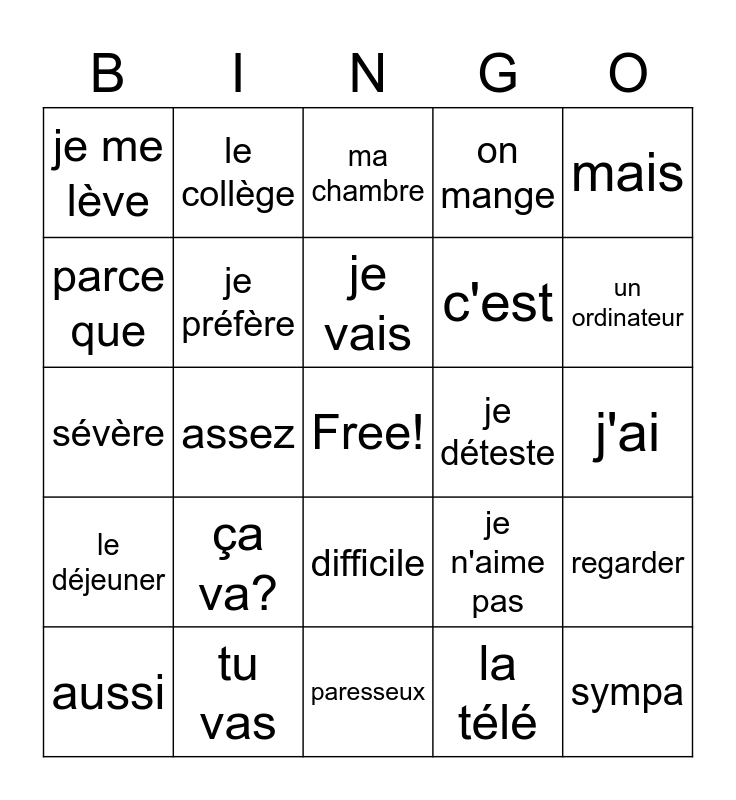 This bingo card has a free space and 24 words: ça va?, tu vas, je vais, aussi, mais, je me lève, parce que, le collège, je déteste, difficile, c'est, sévère, je n'aime pas, regarder, je préfère, la télé, j'ai, ma chambre, un ordinateur, assez, sympa, le déjeuner, on mange and paresseux.