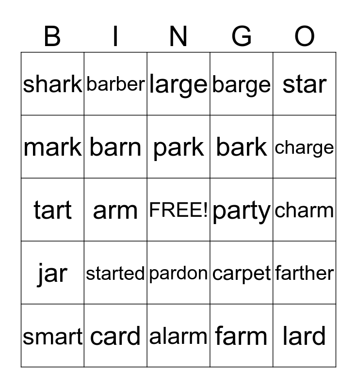 This bingo card has a free space and 24 words: started, card, park, smart, star, shark, mark, barber, party, pardon, bark, tart, carpet, farther, barn, farm, charm, large, charge, arm, lard, jar, barge and alarm.
