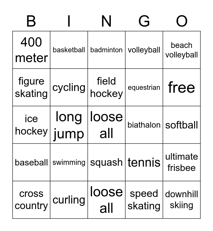 This bingo card has a free space and 24 words: swimming, curling, field hockey, cross country, beach volleyball, 400 meter, figure skating, basketball, biathalon, squash, equestrian, ice hockey, tennis, ultimate frisbee, cycling, speed skating, softball, badminton, free, long jump, downhill skiing, baseball, volleyball and loose all.