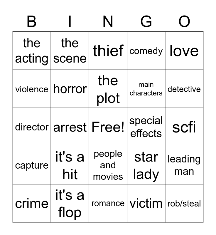 This bingo card has a free space and 24 words: it's a hit, it's a flop, the plot, crime, love, the acting, violence, the scene, special effects, people and movies, main characters, director, star lady, leading man, horror, victim, scfi, thief, detective, arrest, rob/steal, capture, comedy and romance.