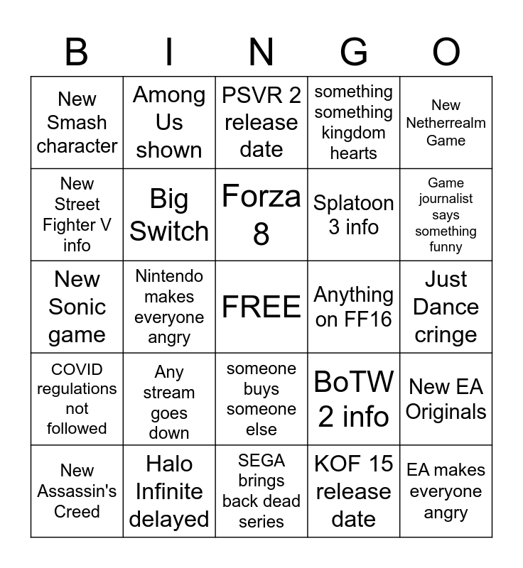 This bingo card has a free space and 24 words: Any stream goes down, Halo Infinite delayed, Forza 8, New Assassin's Creed, New Netherrealm Game, New Smash character, New Street Fighter V info, Among Us shown, Anything on FF16, someone buys someone else, Splatoon 3 info, New Sonic game, BoTW 2 info, New EA Originals, Big Switch, KOF 15 release date, Just Dance cringe, PSVR 2 release date, Game journalist says something funny, Nintendo makes everyone angry, EA makes everyone angry, COVID regulations not followed, something something kingdom hearts and SEGA brings back dead series.