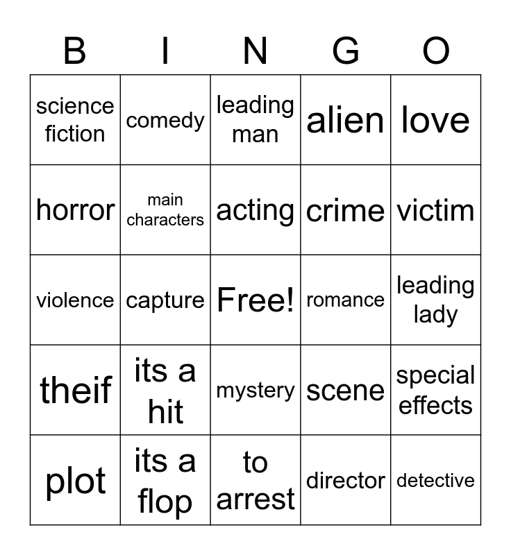 This bingo card has a free space and 24 words: its a hit, its a flop, acting, plot, love, science fiction, horror, comedy, romance, mystery, crime, violence, scene, special effects, main characters, director, leading lady, leading man, victim, capture, detective, theif, alien and to arrest.