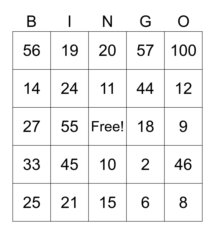 This bingo card has a free space and 29 words: 25, 30, 55, 36, 56, 20, 24, 45, 18, 21, 9, 8, 15, 6, 12, 81, 10, 33, 100, 27, 2, 13, 44, 14, 57, 19, 46, 11 and 99.