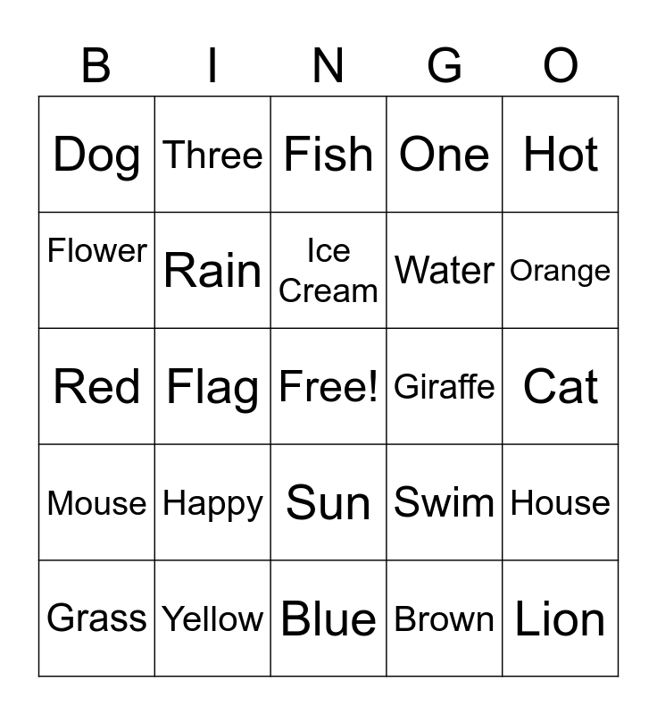 This bingo card has a free space and 29 words: Grass, Cold, Flag, Tree, Dog, Fish, Rain, Happy, Giraffe, Yellow, Cat, Lion, Blue, Brown, Orange, Black, Sun, Mouse, Hot, Red, Swim, Bug, Water, Flower, One, Three, House, Ice Cream and Sandwich.