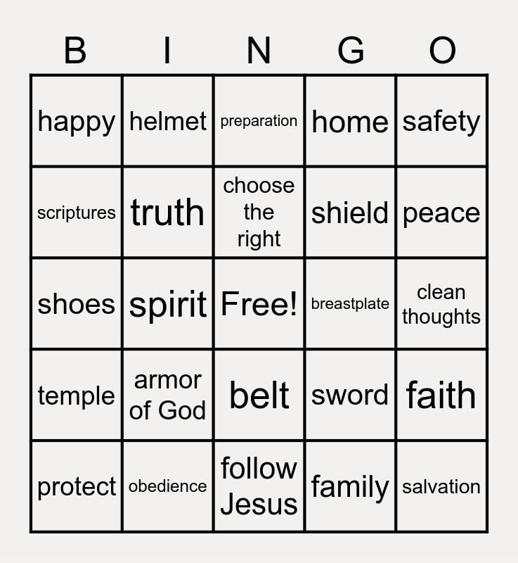 This bingo card has a free space and 25 words: armor of God, follow Jesus, choose the right, protect, safety, happy, scriptures, helmet, breastplate, belt, shield, shoes, sword, faith, truth, righteous, clean thoughts, preparation, peace, spirit, salvation, obedience, temple, home and family.