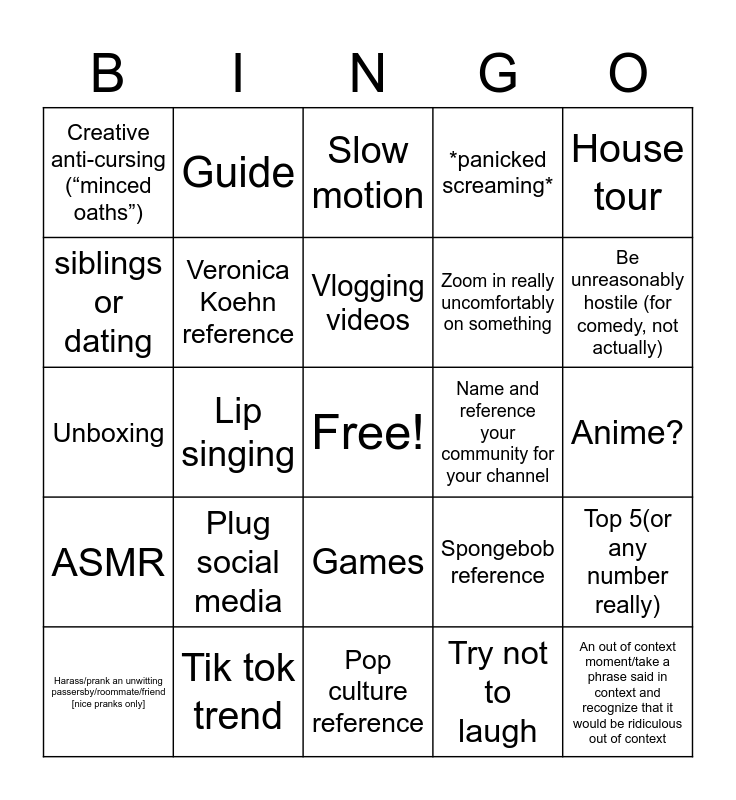 This bingo card has a free space and 40 words: Bloopers, Unboxing, High pitched voice edit for comedic effect, Veronica Koehn reference, Tik tok trend, Games, Vlogging videos, tutorial, House tour, ASMR, Lip singing, *panicked screaming*, An out of context moment/take a phrase said in context and recognize that it would be ridiculous out of context, Anime?, Name and reference your community for your channel, Plug social media, Media analysis(reframe as necessary), Creative anti-cursing (“minced oaths”), Bush’s baked beans must appear. You do not have to address its presence, Slow motion, Top 5(or any number really), Try not to laugh, Zoom in really uncomfortably on something, siblings or dating, Food, Sun Tzu’s the Art of War, Opening skit, Pets, Reference a Team Fortress 2 meet the team video, surreal random thoughts/randomness, Early 2000’s MLG edit (airhorn mandatory) (AKA a moment of over the top montage/edits with airhorn and/or dubstep), Harass/prank an unwitting passersby/roommate/friend [nice pranks only], Celebrity impersonation, Spongebob reference, Be unreasonably hostile (for comedy, not actually), Pop culture reference, COVID reference, EXPOSED, Guide and Oregon Tech specific reference.