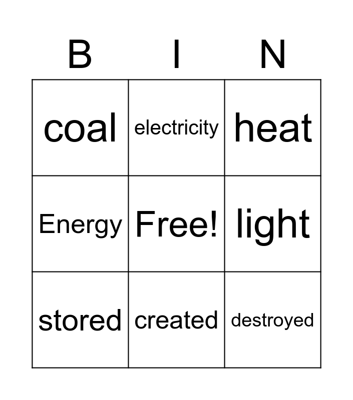 This bingo card has a free space and 8 words: Energy, electricity, light, stored, heat, coal, created and destroyed.