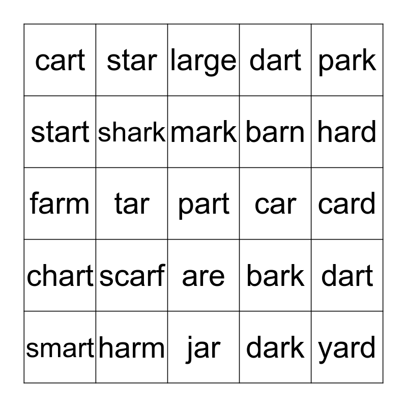 This bingo card has a free space and 24 words: scarf, harm, mark, smart, park, cart, start, star, car, are, barn, farm, bark, dart, shark, dark, card, large, hard, tar, yard, chart, dart and jar.