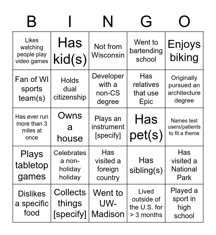 This bingo card has a free space and 24 words: Celebrates a non-holiday holiday, Collects things [specify], Developer with a non-CS degree, Dislikes a specific food, Enjoys biking, Likes watching people play video games, Fan of WI sports team(s), Has kid(s), Has pet(s), Has visited a foreign country, Has relatives that use Epic, Has ever run more than 3 miles at once, Has sibling(s), Has visited a National Park, Holds dual citizenship, Lived outside of the U.S. for > 3 months, Names test users/patients to fit a theme, Not from Wisconsin, Originally pursued an architecture degree, Owns a house, Played a sport in high school, Plays tabletop games, Went to bartending school and Went to UW-Madison.