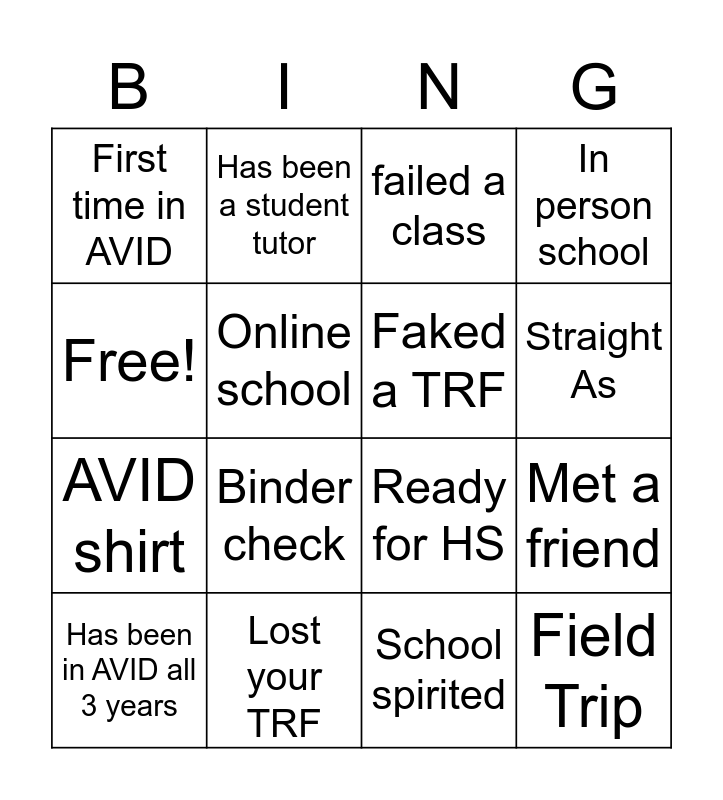 This bingo card has 16 words: Lost your TRF, Met a friend, failed a class, First time in AVID, AVID shirt, Has been a student tutor, Ready for HS, School spirited, Free!, Online school, Has been in AVID all 3 years, In person school, Binder check, Straight As, Faked a TRF and Field Trip.