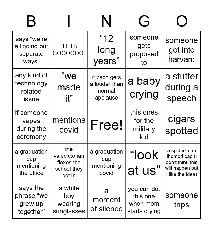This bingo card has a free space and 29 words: says the phrase “we grew up together”, mentions DC, mentions covid, says “if we can go to school during a pandemic, we can do anything”, says “we’re all going out separate ways”, “12 long years”, “we made it”, the valedictorian flexes the school they got in, this ones for the military kid, a white boy wearing sunglasses, cigars spotted, someone trips, a moment of silence, you can dot this one when mom starts crying, a stutter during a speech, dog spotted, a graduation cap mentioning covid, a graduation cap mentioning the office, someone got into harvard, if someone vapes during the ceremony, “look at us”, the football team gets clout, a baby crying, any kind of technology related issue, someone gets proposed to, “LETS GOOOOOO”, a spider-man themed cap (i don’t think this will happen but i like the idea), if zach gets a louder than normal applause and if you hear ymca played at all.