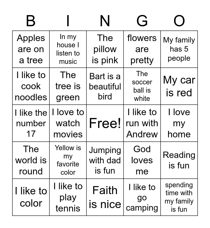 This bingo card has a free space and 24 words: Yellow is my favorite color, I like to play tennis, Bart is a beautiful bird, I like to color, My family has 5 people, Apples are on a tree, I like to cook noodles, In my house I listen to music, I like to run with Andrew, Jumping with dad is fun, The soccer ball is white, I like the number 17, God loves me, Reading is fun, The tree is green, I like to go camping, I love my home, The pillow is pink, My car is red, I love to watch movies, spending time with my family is fun, The world is round, flowers are pretty and Faith is nice.