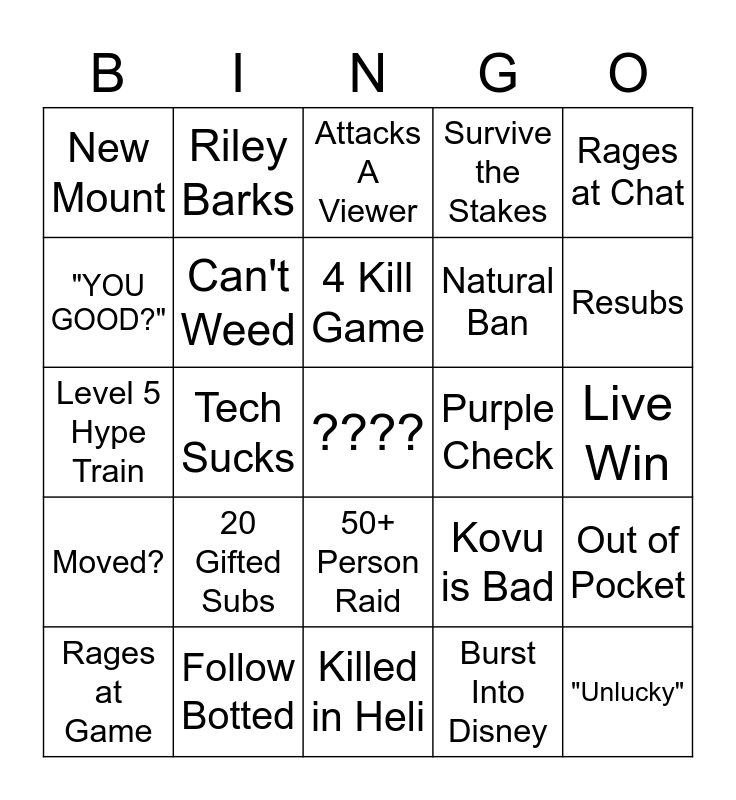 This bingo card has a free space and 24 words: 20 Gifted Subs, Follow Botted, 4 Kill Game, Rages at Game, Rages at Chat, New Mount, "YOU GOOD?", Riley Barks, Purple Check, 50+ Person Raid, Natural Ban, Level 5 Hype Train, Kovu is Bad, Out of Pocket, Can't Weed, Burst Into Disney, Live Win, Attacks A Viewer, Resubs, Tech Sucks, "Unlucky", Moved?, Survive the Stakes and Killed in Heli.