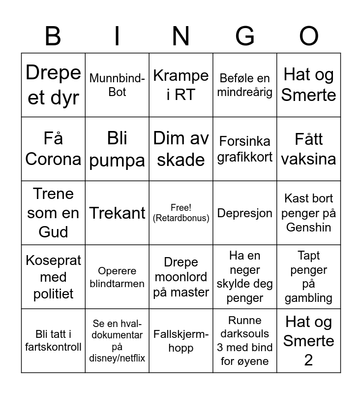 This bingo card has a free space and 24 words: Operere blindtarmen, Se en hval-dokumentar på disney/netflix, Dim av skade, Bli tatt i fartskontroll, Hat og Smerte, Drepe et dyr, Få Corona, Munnbind-Bot, Depresjon, Drepe moonlord på master, Forsinka grafikkort, Trene som en Gud, Ha en neger skylde deg penger, Tapt penger på gambling, Bli pumpa, Runne darksouls 3 med bind for øyene, Kast bort penger på Genshin, Krampe i RT, Fått vaksina, Trekant, Hat og Smerte 2, Koseprat med politiet, Beføle en mindreårig and Fallskjerm-hopp.