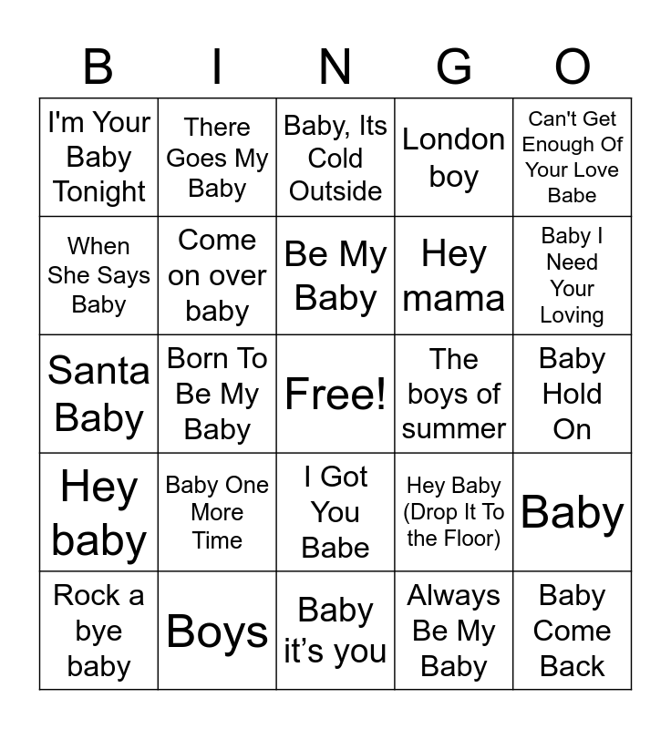 This bingo card has a free space and 42 words: Baby Love, Be My Baby, Baby Got Back, Baby One More Time, Always Be My Baby, Baby, Baby Come Back, Love to Love You Baby, Baby, Its Cold Outside, I Got You Babe, Baby Hold On, Baby I Need Your Loving, Born To Be My Baby, Can't Get Enough Of Your Love Babe, Doing It All For My Baby, Hey Baby (Drop It To the Floor), Ice Ice Baby, Santa Baby, Runaway Baby, There Goes My Baby, When She Says Baby, Yes Sir, That's My Baby, Give It To Me Baby, I'm Your Baby Tonight, Baby shark, Mamacita, Hey mama, Mama, Baby Boy, Be my baby tonight, Baby-baby-baby, Hey baby, Come on over baby, Baby it’s you, Baby don’t go, Rock a bye baby, Boys, The boys of summer, Sk8er Boi, Rude boy, London boy and Oh boy.