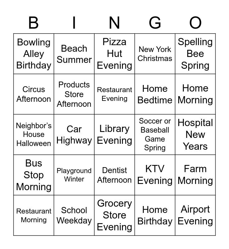This bingo card has 25 words: Playground Winter, Grocery Store Evening, Restaurant Evening, Restaurant Morning, Spelling Bee Spring, Bowling Alley Birthday, Circus Afternoon, Beach Summer, Soccer or Baseball Game Spring, Dentist Afternoon, Home Bedtime, Neighbor’s House Halloween, KTV Evening, Farm Morning, Products Store Afternoon, Airport Evening, Hospital New Years, Pizza Hut Evening, Home Morning, Car Highway, Library Evening, School Weekday, Bus Stop Morning, New York Christmas and Home Birthday.
