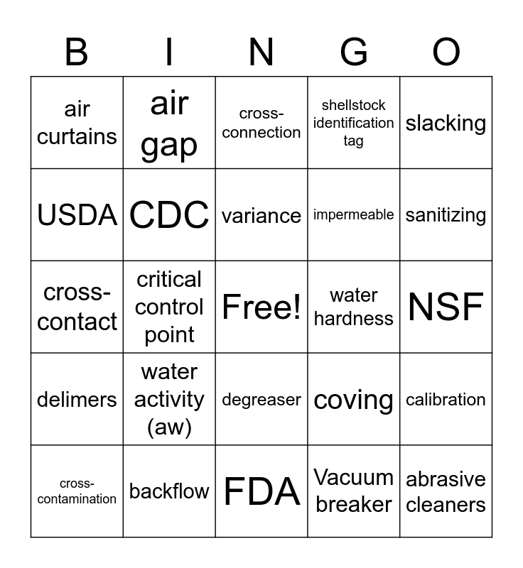This bingo card has a free space and 24 words: water activity (aw), backflow, variance, cross-contamination, slacking, air curtains, USDA, air gap, water hardness, degreaser, impermeable, cross-contact, coving, calibration, CDC, Vacuum breaker, NSF, cross-connection, sanitizing, critical control point, abrasive cleaners, delimers, shellstock identification tag and FDA.