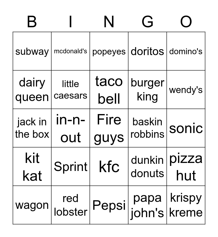 This bingo card has a free space and 24 words: Sprint, red lobster, taco bell, wagon, domino's, subway, dairy queen, mcdonald's, baskin robbins, kfc, burger king, jack in the box, dunkin donuts, pizza hut, little caesars, papa john's, sonic, popeyes, wendy's, in-n-out, krispy kreme, kit kat, doritos and Pepsi.