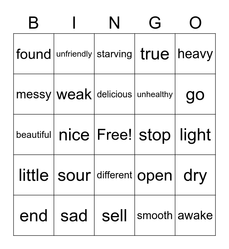 This bingo card has a free space and 24 words: sour, sad, delicious, end, heavy, found, messy, unfriendly, stop, different, unhealthy, beautiful, open, dry, weak, smooth, light, starving, go, nice, awake, little, true and sell.
