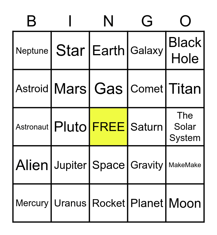 This bingo card has a free space and 29 words: Mercury, The Sun, Pluto, Venus, Neptune, Earth, Mars, Jupiter, Saturn, Uranus, The Solar System, Moon, Rocket, Planet, Titan, Ganymede, Space, Alien, Black Hole, Astronaut, Gravity, Red Planet, Comet, Astroid, Galaxy, Star, MakeMake, Gas and Life.