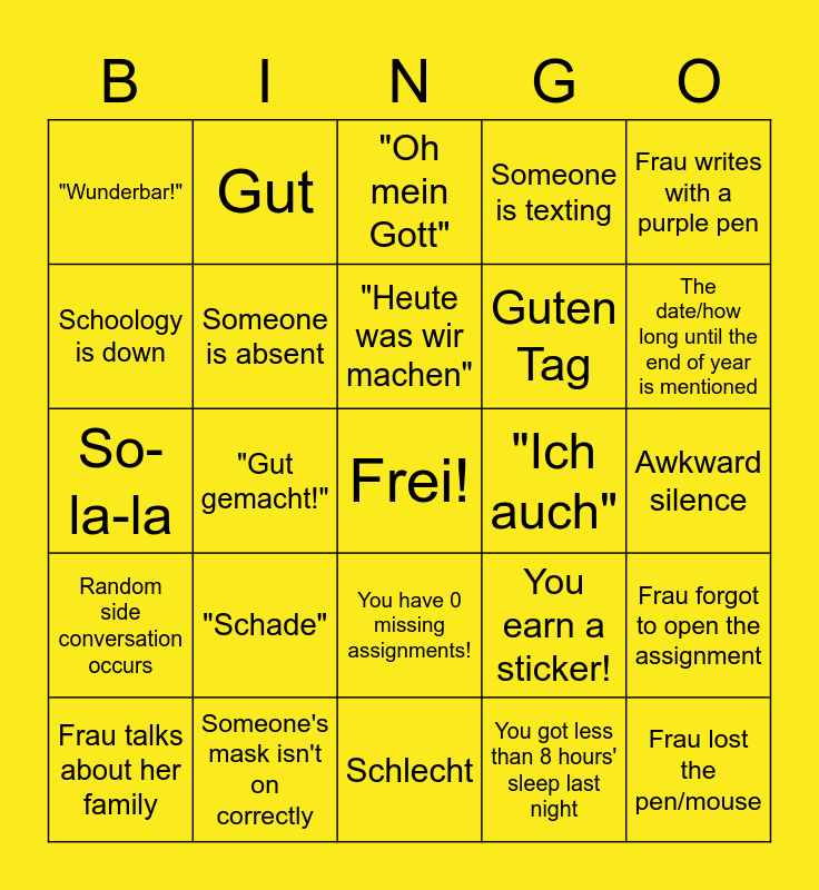 This bingo card has a free space and 36 words: "Hallo Leute", Frau sits on stool or chair, "Oh nein", Someone is absent, You earn a sticker!, Random side conversation occurs, "Heute was wir machen", Tschüß!, Frau writes with a purple pen, Directions are repeated more than 3 times, "Gut gemacht!", Someone is texting, Sits on desk, "Ich auch", The date/how long until the end of year is mentioned, "Wunderbar!", "Ja oder nein", "Schade", Frau lost the pen/mouse, "Oh mein Gott", Awkward silence, Frau forgot to open the assignment, Someone's mask isn't on correctly, Frau talks about her family, Schlecht, Gut, So-la-la, Guten Morgen, Guten Tag, Schoology is down, You earn a piece of candy!, The Schätzkönig*in is in your class!, You got less than 8 hours' sleep last night, You have 0 missing assignments!, You're taking German next year! and You passed the year!.