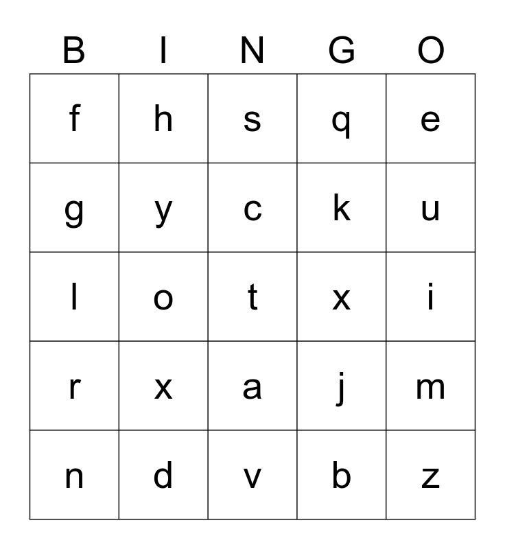 This bingo card has 26 words: a, b, c, d, e, f, g, h, i, j, k, l, m, n, o, p, q, r, s, t, u, v, x, x, y and z.