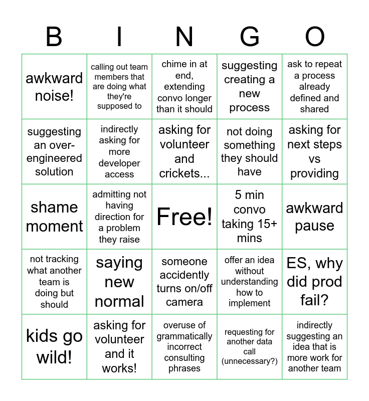 This bingo card has a free space and 24 words: saying new normal, asking for volunteer and it works!, asking for volunteer and crickets..., kids go wild!, ask to repeat a process already defined and shared, awkward noise!, suggesting an over-engineered solution, calling out team members that are doing what they're supposed to, 5 min convo taking 15+ mins, someone accidently turns on/off camera, not doing something they should have, shame moment, offer an idea without understanding how to implement, ES, why did prod fail?, indirectly asking for more developer access, requesting for another data call (unnecessary?), awkward pause, chime in at end, extending convo longer than it should, asking for next steps vs providing, admitting not having direction for a problem they raise, indirectly suggesting an idea that is more work for another team, not tracking what another team is doing but should, suggesting creating a new process and overuse of grammatically incorrect consulting phrases.
