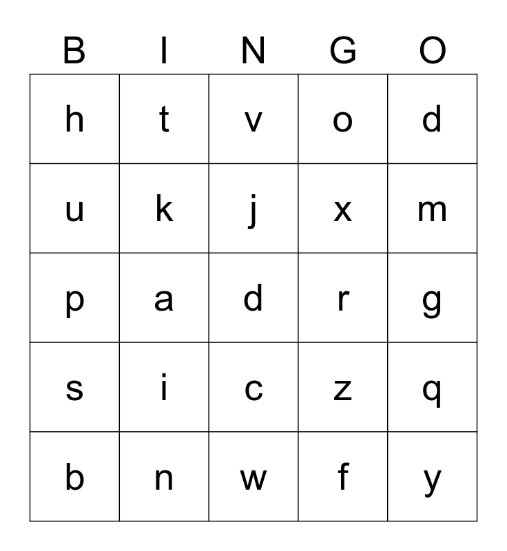 This bingo card has 27 words: z, y, x, w, u, v, t, s, r, q, p, o, b, n, m, l, k, j, i, h, g, f, a, d, c, d and e.