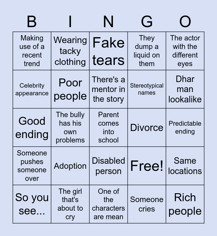 This bingo card has 25 words: Adoption, One of the characters are mean, There's a mentor in the story, So you see..., The actor with the different eyes, Making use of a recent trend, Celebrity appearance, Wearing tacky clothing, Divorce, Disabled person, Stereotypical names, Good ending, Free!, Same locations, Poor people, Rich people, Predictable ending, Fake tears, Dhar man lookalike, The bully has his own problems, Parent comes into school, The girl that's about to cry, Someone pushes someone over, They dump a liquid on them and Someone cries.
