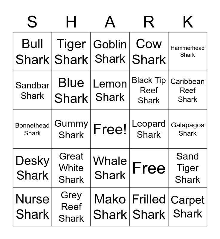 This bingo card has a free space and 25 words: Great White Shark, Mako Shark, Lemon Shark, Nurse Shark, Hammerhead Shark, Bull Shark, Sandbar Shark, Tiger Shark, Leopard Shark, Whale Shark, Black Tip Reef Shark, Bonnethead Shark, Free, Sand Tiger Shark, Blue Shark, Epaulette Shark, Galapagos Shark, Goblin Shark, Caribbean Reef Shark, Gummy Shark, Carpet Shark, Grey Reef Shark, Desky Shark, Cow Shark and Frilled Shark.