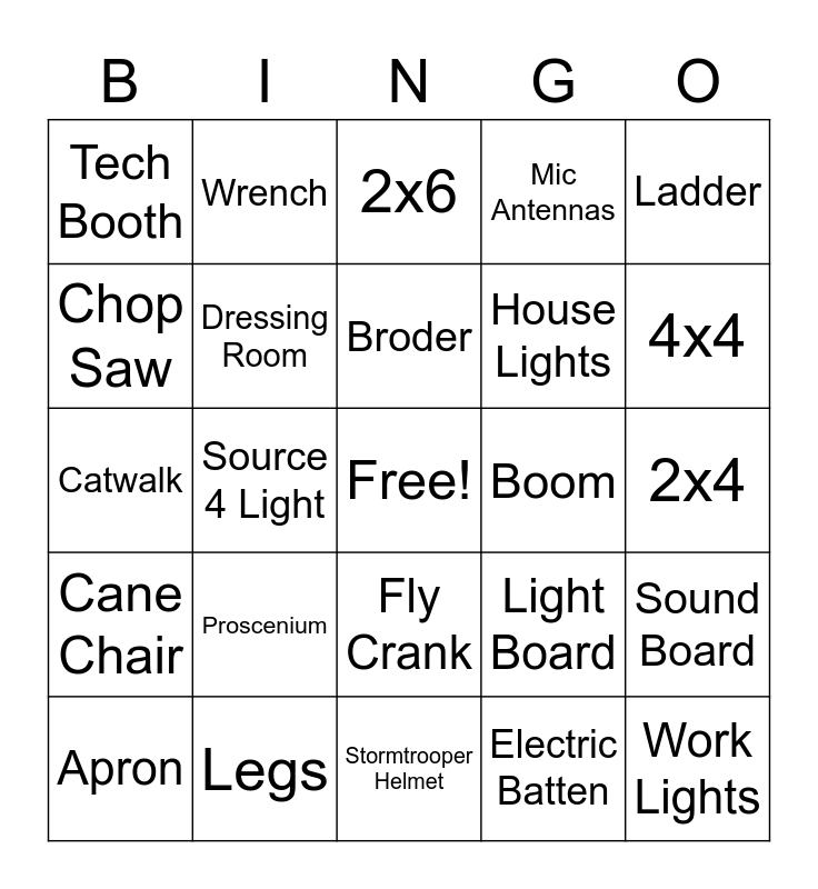 This bingo card has a free space and 24 words: Proscenium, Legs, Broder, Apron, Ladder, Tech Booth, Chop Saw, Wrench, Boom, Fly Crank, House Lights, Catwalk, Light Board, Sound Board, Dressing Room, Electric Batten, 2x4, 2x6, 4x4, Source 4 Light, Work Lights, Cane Chair, Mic Antennas and Stormtrooper Helmet.