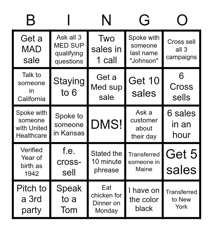 This bingo card has a free space and 24 words: f.e. cross-sell, Speak to a Tom, Get a Med sup sale, Pitch to a 3rd party, Cross sell all 3 campaigns, Get a MAD sale, Talk to someone in California, Ask all 3 MED SUP qualifying questions, Ask a customer about their day, Stated the 10 minute phrease, Get 10 sales, Spoke with someone with United Healthcare, Transferred someone in Maine, Get 5 sales, Staying to 6, I have on the color black, 6 sales in an hour, Two sales in 1 call, 6 Cross sells, Spoke to someone in Kansas, Transferred to New York, Verified Year of birth as 1942, Spoke with someone last name "Johnson" and Eat chicken for Dinner on Monday.
