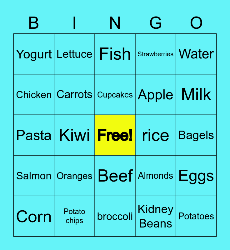 This bingo card has a free space and 24 words: Corn, Oranges, Cupcakes, Kidney Beans, Water, Yogurt, Lettuce, Fish, rice, Bagels, Pasta, Carrots, Almonds, Eggs, Chicken, Potato chips, broccoli, Strawberries, Milk, Salmon, Kiwi, Beef, Apple and Potatoes.