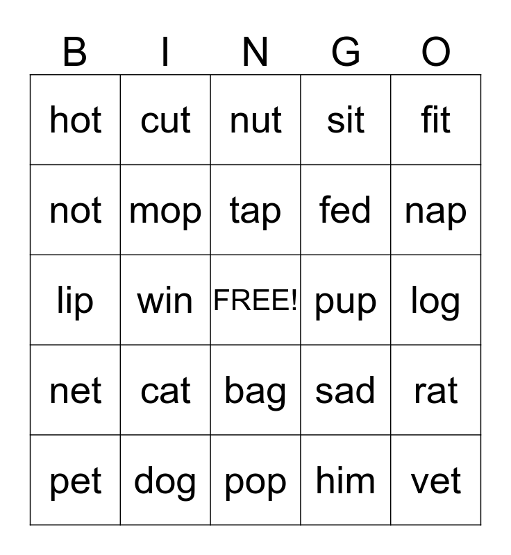This bingo card has a free space and 24 words: cat, dog, tap, pet, fit, hot, not, cut, pup, bag, fed, lip, sad, rat, mop, him, log, nut, nap, win, vet, net, sit and pop.