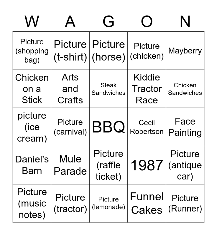 This bingo card has 25 words: Mule Parade, Picture (lemonade), Steak Sandwiches, Picture (music notes), Mayberry, Picture (shopping bag), Chicken on a Stick, Picture (t-shirt), Cecil Robertson, Picture (raffle ticket), Kiddie Tractor Race, picture (ice cream), 1987, Picture (antique car), Arts and Crafts, Picture (Runner), Face Painting, Picture (horse), Chicken Sandwiches, Picture (carnival), BBQ, Picture (tractor), Daniel's Barn, Picture (chicken) and Funnel Cakes.