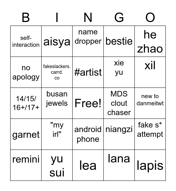 This bingo card has a free space and 31 words: lea, subtweet, busan jewels, fanservice paradox mtl, self-interaction, name dropper, fakeslackers. carrd. co, niangzi, MDS clout chaser, lana, new to danmeitwt, lapis, junta, my close moot sbed me 😭, xil, syasya, fake s* attempt, "my irl", garnet, android phone, he zhao, rts tweets from old acc, remini, aisya, xie yu, no apology, bestie, 14/15/ 16+/17+, yu sui, #artist and wei xiao.