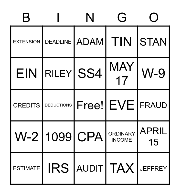 This bingo card has a free space and 24 words: 1099, IRS, SS4, ESTIMATE, STAN, EXTENSION, EIN, DEADLINE, EVE, CPA, MAY 17, CREDITS, ORDINARY INCOME, APRIL 15, RILEY, TAX, FRAUD, ADAM, W-9, DEDUCTIONS, JEFFREY, W-2, TIN and AUDIT.