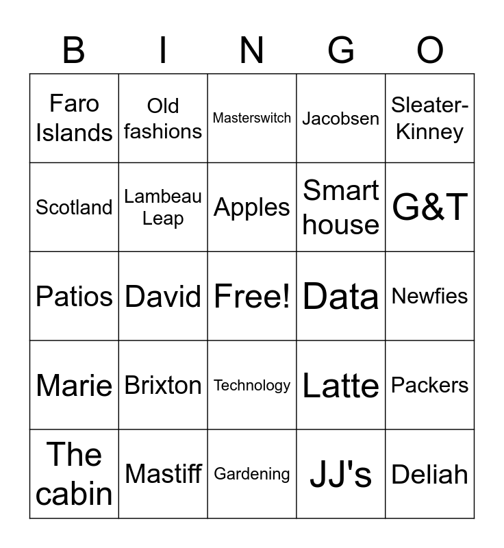 This bingo card has a free space and 25 words: Brixton, Gardening, Apples, The cabin, Sleater-Kinney, Faro Islands, Scotland, Old fashions, Data, Technology, Smart house, Patios, Latte, Packers, Lambeau Leap, St. Norbert’s, Newfies, Masterswitch, G&T, David, Deliah, Mastiff, Marie, Jacobsen and JJ's.