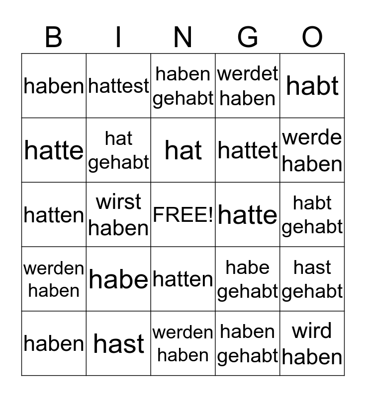 This bingo card has a free space and 24 words: habe, hast, hat, haben, habt, haben, hatte, hattest, hatte, hatten, hattet, hatten, habe gehabt, hast gehabt, hat gehabt, haben gehabt, habt gehabt, haben gehabt, werde haben, wirst haben, wird haben, werden haben, werdet haben and werden haben.