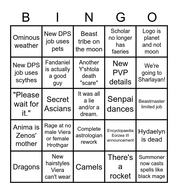 This bingo card has 25 words: Rage at no male Viera or female Hrothgar, Camels, Another Y'shtola death "scare", Dragons, Logo is planet and not moon, Ominous weather, New DPS job uses scythes, New DPS job uses pets, Senpai dances, Complete astrologian rework, New PVP details, "Please wait for it.", Encyclopaedia Eorzea III announcement, Hydaelyn is dead, Fandaniel is actually a good guy, Summoner now casts spells like black mage, Beastmaster limited job, Beast tribe on the moon, We're going to Sharlayan!, Secret Ascians, It was all a lie and/or a dream., New hairstyles Viera can't wear, Anima is Zenos' mother, Scholar no longer has faeries and There's a rocket.