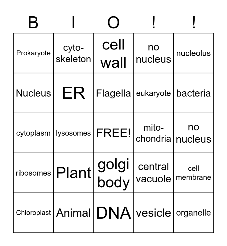 This bingo card has a free space and 24 words: Plant, Animal, Flagella, Chloroplast, nucleolus, Prokaryote, Nucleus, cyto-skeleton, mito-chondria, golgi body, eukaryote, cytoplasm, central vacuole, cell membrane, ER, vesicle, no nucleus, cell wall, bacteria, lysosomes, organelle, ribosomes, no nucleus and DNA.