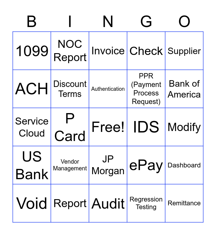 This bingo card has a free space and 24 words: Vendor Management, Report, Authentication, Void, Supplier, 1099, ACH, NOC Report, IDS, JP Morgan, PPR (Payment Process Request), Service Cloud, ePay, Dashboard, Discount Terms, Regression Testing, Modify, Invoice, Bank of America, P Card, Remittance, US Bank, Check and Audit.