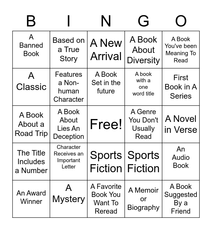 This bingo card has a free space and 24 words: Character Receives an Important Letter, A Mystery, A Book Set in the future, An Award Winner, A Book You've been Meaning To Read, A Banned Book, A Classic, Based on a True Story, A Genre You Don't Usually Read, Sports Fiction, A book with a one word title, A Book About a Road Trip, Sports Fiction, An Audio Book, Features a Non-human Character, A Memoir or Biography, A Novel in Verse, A New Arrival, First Book in A Series, A Book About Lies An Deception, A Book Suggested By a Friend, The Title Includes a Number, A Book About Diversity and A Favorite Book You Want To Reread.